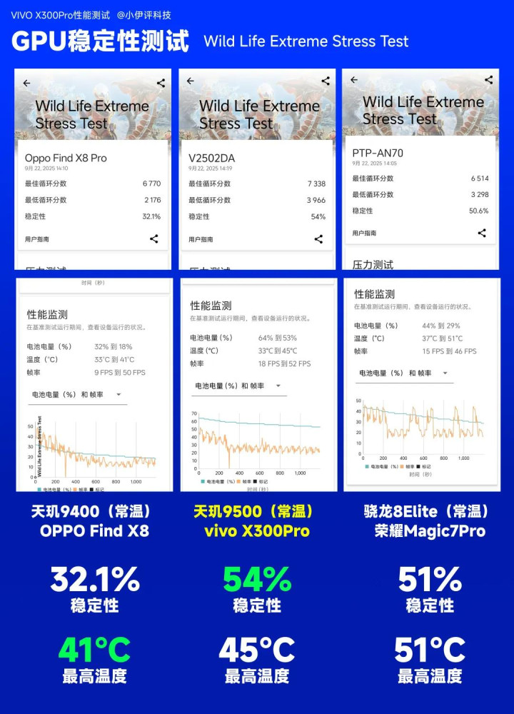 整体来说,vivo X300 Pro在这个环节的表现还不错,稳定性是最好的,稳定率达到了54%,比搭载天玑9400的OPPO Find X8Pro强了一大截,性能衰减曲线也比较平缓,相比搭载骁龙8 Elite的荣耀Magic 7pro要好一些。