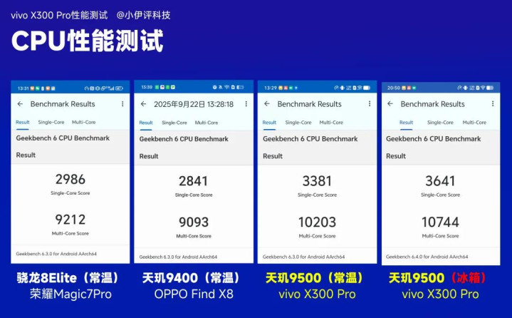 CPU部分我们主要以Geekbench V6.3作为评测工具,会分为常温状态下跑分(室温约26度)、冰箱跑分状态(极限性能),参与对比的两款机型分别为友商天玑9400和骁龙8 Elite机型(均会开启各家电源中的性能模式),成绩如下所示: