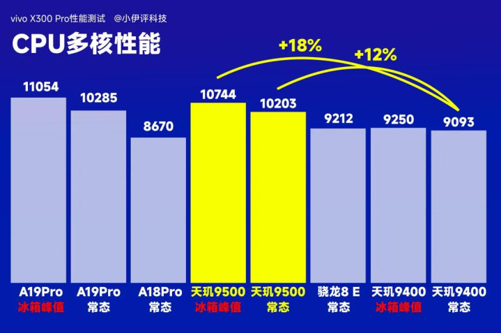 所以大家可以看到,在这个测试的环节中,天玑9500相比天玑9400的优势就进一步的拉开了,达到了20%左右,但是相对的在冰箱环境下的提升幅度也没有那么大了,仅仅值提升了3%左右。