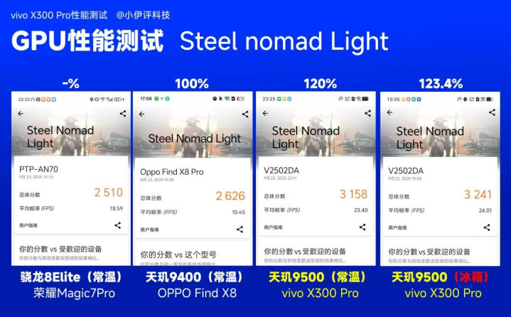 可以看出,在这个测试下,温度对于极限性能的发挥是有很大影响的,在常温状态下,vivo X300 Pro所搭载的天玑9500相比前代芯片仅提升10%左右,提升幅度较小。但是在冰箱模式下,跑分则进一步提升了约8%左右。